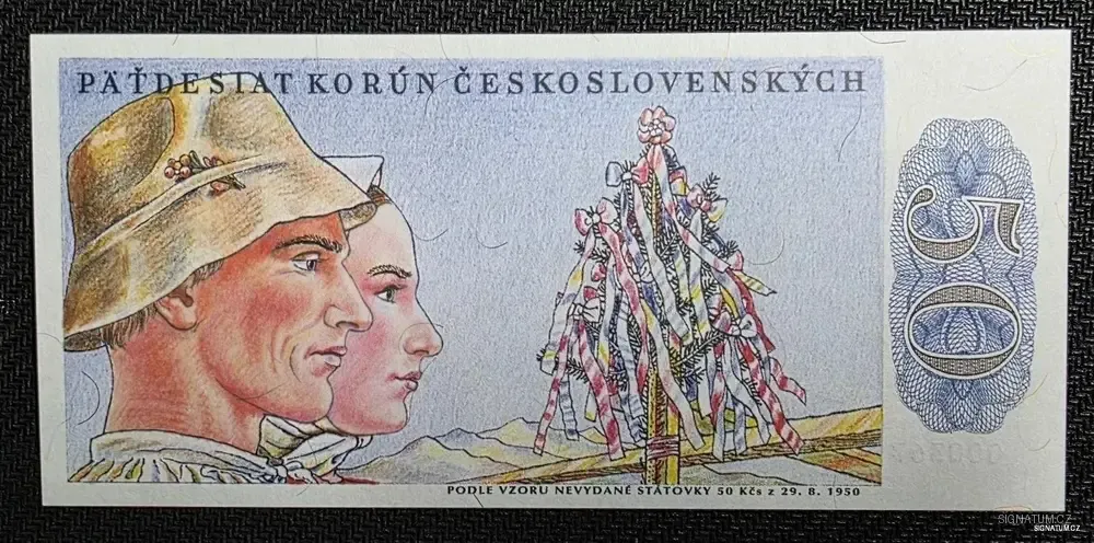 Tato bankovka je fascinující ukázkou toho, jak mohla vypadat československá platidla v 50. letech. Původní návrh slavného umělce Karla Svolinského se do oběhu nikdy nedostal. Zajímavostí je, že originální zkušební tisky z roku 1950 měly vertikální číslování, zatímco tento novotisk z roku 2003 používá číslování horizontální. Pro sběratele jde o dostupnou cestu, jak doplnit sbírku o jeden z nejkrásnějších nerealizovaných návrhů naší historie.