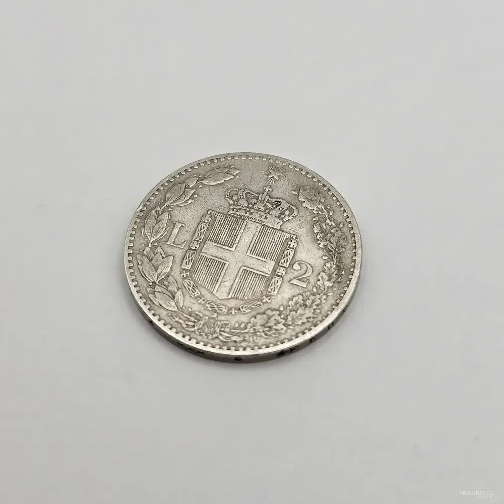 Nabízíme k prodeji krásnou historickou stříbrnou minci Italského království z konce 19. století. Na lícní straně je detailně zpracovaný portrét krále Umberta I., zvaného Dobrý, jehož vláda byla tragicky ukončena atentátem v roce 1900. Rubové straně dominuje korunovaný znak Savojské dynastie obklopený vavřínovým a dubovým věncem.