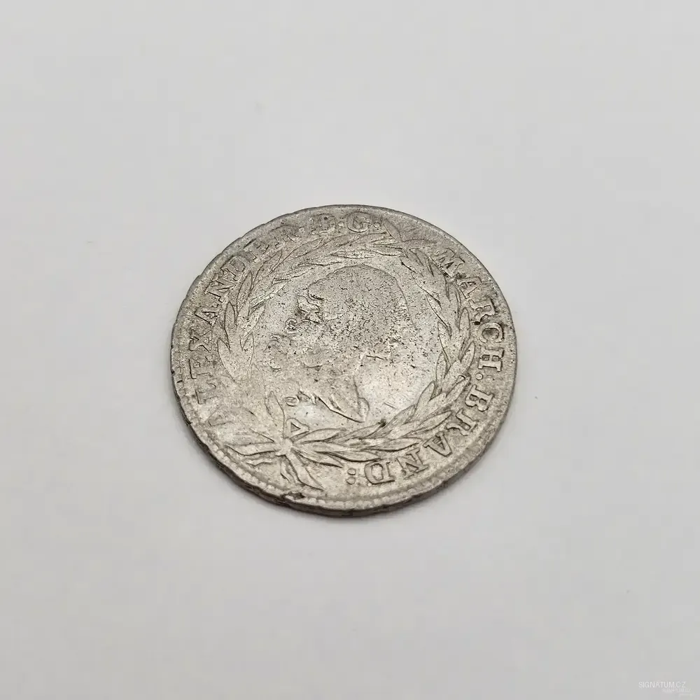 Ve středu rubové strany se nachází zdobná kartuše s jasnou číslicí 20, která označuje hodnotu v krejcarech (odpovídá 1/6 tolaru). Pod kartuší je vyražen letopočet 1762. Nejzajímavějším prvkem je však opis u horního okraje: LX ST: EINE FEINE MARK. Jde o historickou účetní deklaraci konvenční měny, která znamená „60 Stück eine feine Mark“ – tedy že z jedné kolínské marky čistého stříbra (cca 234 gramů) bylo vyraženo přesně 60 těchto mincí.