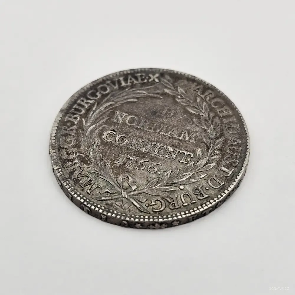 Nádherný exemplář konvenčního tolaru Marie Terezie z roku 1766. Na rozdíl od běžně dostupných novoražeb (s letopočtem 1780) se v tomto případě jedná o původní dobovou ražbu. Mince pochází z mincovny Burgau (Přední Rakousy), což potvrzuje opis na rubové straně.