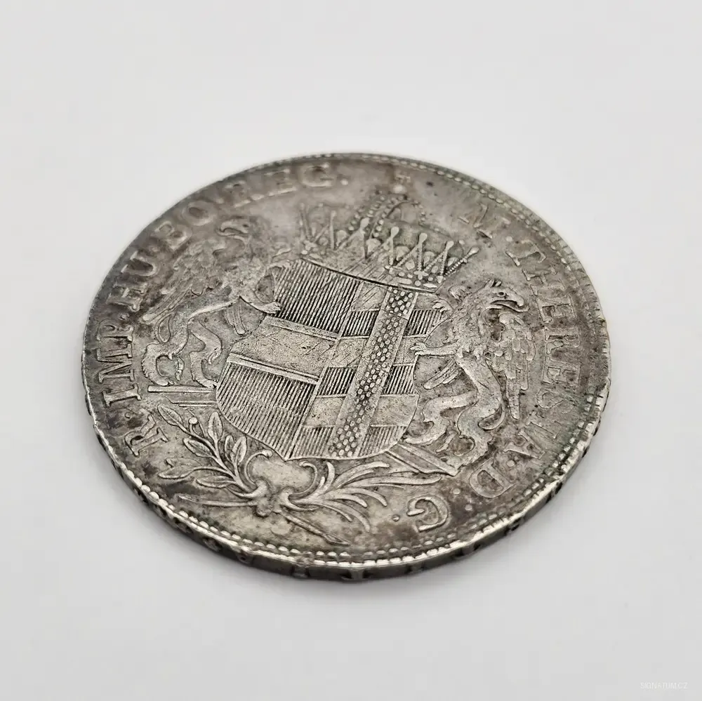 Korunovaný znak s říšským orlem, opis: M. THERESIA. D. G. R. IMP. HU. BO. REG. (Marie Terezie, z Boží milosti císařovna římská, královna uherská a česká).