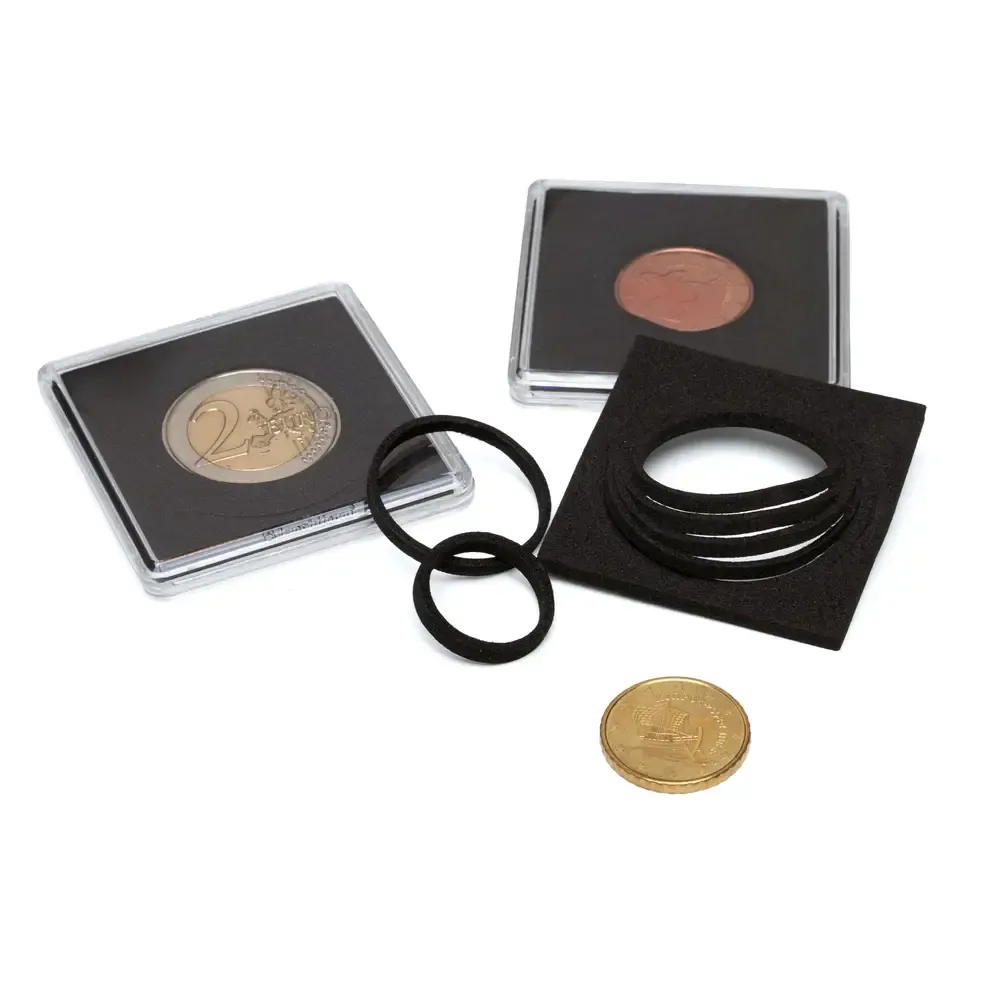 - Systém vložek: Kapsle obsahuje černé pěnové prstence bez obsahu kyselin a změkčovadel, které lze snadno vyjmout a přizpůsobit konkrétní minci.