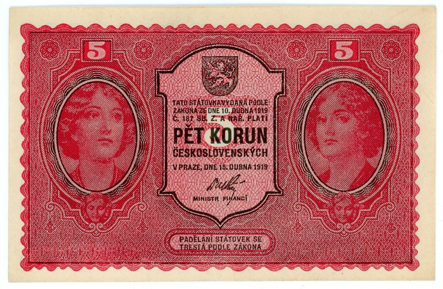 Tato "pětka" vznikla z nutnosti. Po rozpadu Rakouska-Uherska chyběly drobné peníze, protože stříbrné a niklové mince lidé schovávali. Stát proto musel narychlo vytisknout tyto papírové "drobné". Tiskly se ve velkém spěchu v soukromých tiskárnách, proto je papír často nekvalitní. Najít dnes kus, který není rozpadlý nebo špinavý, je malé vítězství.