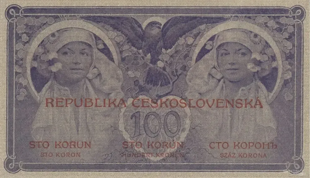 Toto je "porodní" bankovka republiky. Vznikla v době, kdy se stát teprve formoval a potřeboval rychle nahradit okolkované rakousko-uherské koruny. Alfons Mucha ji navrhl v rekordním čase. Kvůli nedokonalé technice tisku se ji dařilo padělat, proto byla brzy nahrazena technicky dokonalejší "zelenou" stovkou z roku 1920. Dnes je to sběratelský svatý grál.
