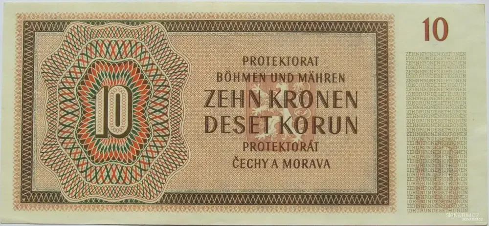 Tato desetikoruna nahradila starší přetiskované československé bankovky a protektorátní desetikorunu z roku 1940. Její motiv (mladá dívka a plody země) měl opět evokovat klid a hojnost, což bylo v roce 1942 (období Heydrichiády a tuhého válečného režimu) spíše propagandistickým přáním než realitou. Je to jedna z nejběžnějších protektorátních bankovek, často se vyskytuje v pozůstalostech.