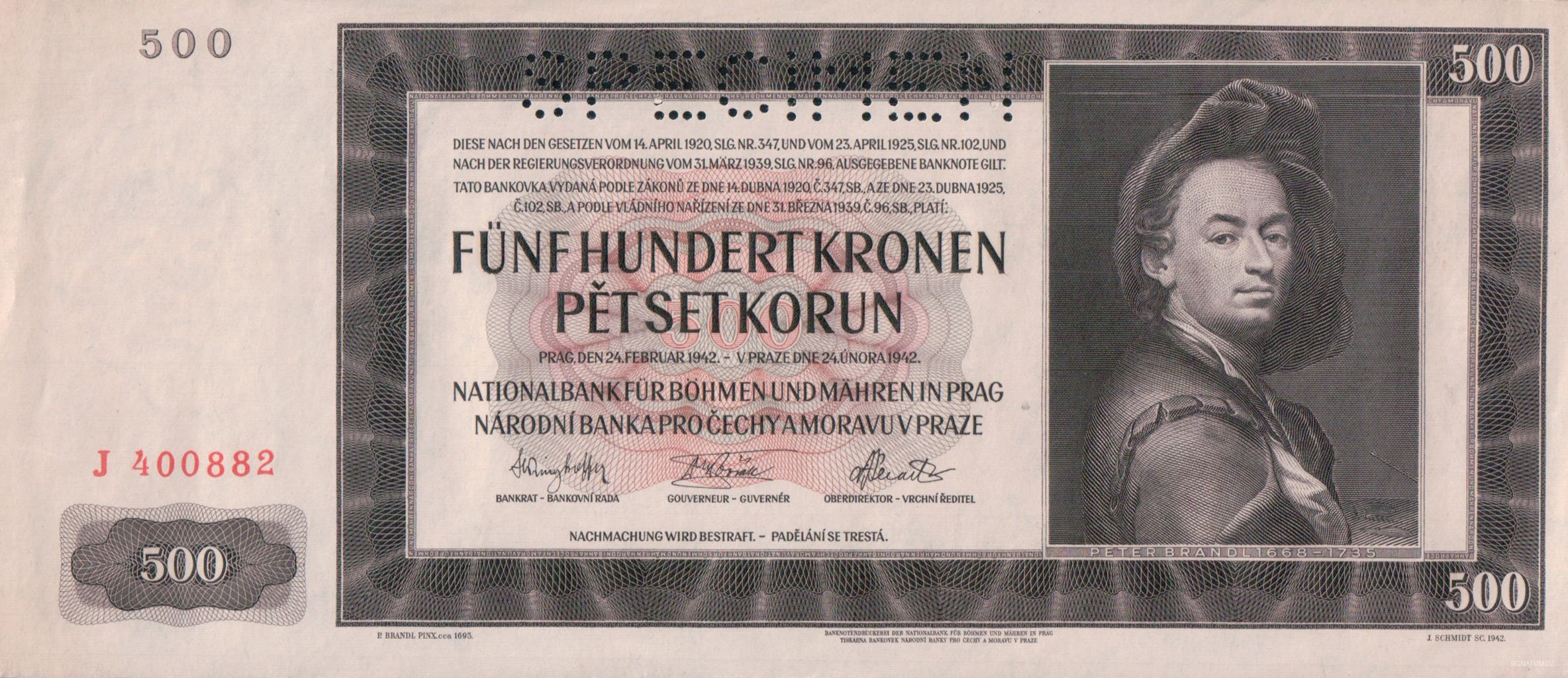 Tato bankovka byla vydána uprostřed války, kdy nacistická správa plně kontrolovala hospodářství Protektorátu. Volba Petra Brandla jako motivu byla z hlediska okupační správy „bezpečná“ – šlo o uznávaného umělce, jehož dílo nebylo politicky kontroverzní. Pro sběratele je tato bankovka zajímavá nejen svou historií, ale především ryteckým mistrovstvím Jindry Schmidta, který dokázal olejomalbu převést do podoby bankovkové rytiny s neuvěřitelnou citlivostí.