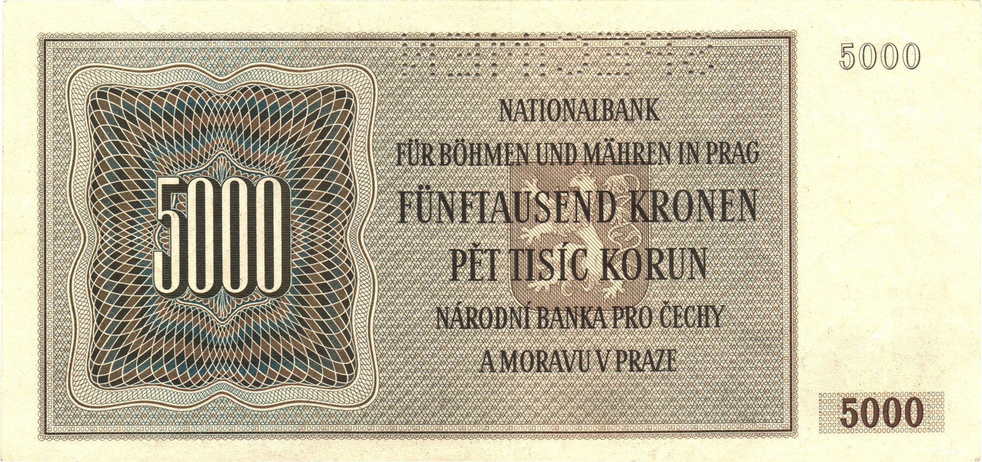 Dominantním prvkem pravé části je detailní portrét hlavy svatého Václava v přilbici (podle slavné sochy Josefa Václava Myslbeka na Václavském náměstí). Vlevo je uveden nominál „FÜNFTAUSEND KRONEN / PĚT TISÍC KORUN“ a texty vydávající banky. Podklad tvoří jemný gilošovaný rastr v béžových a hnědých tónech.